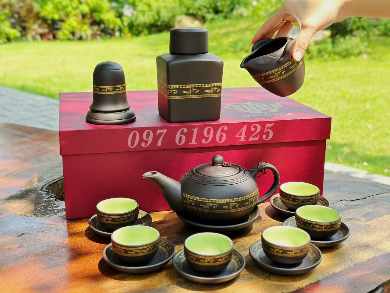 • 1 ấm, 6 chén, 7 đĩa kê, lọ trà, ống tăm, cốc nước