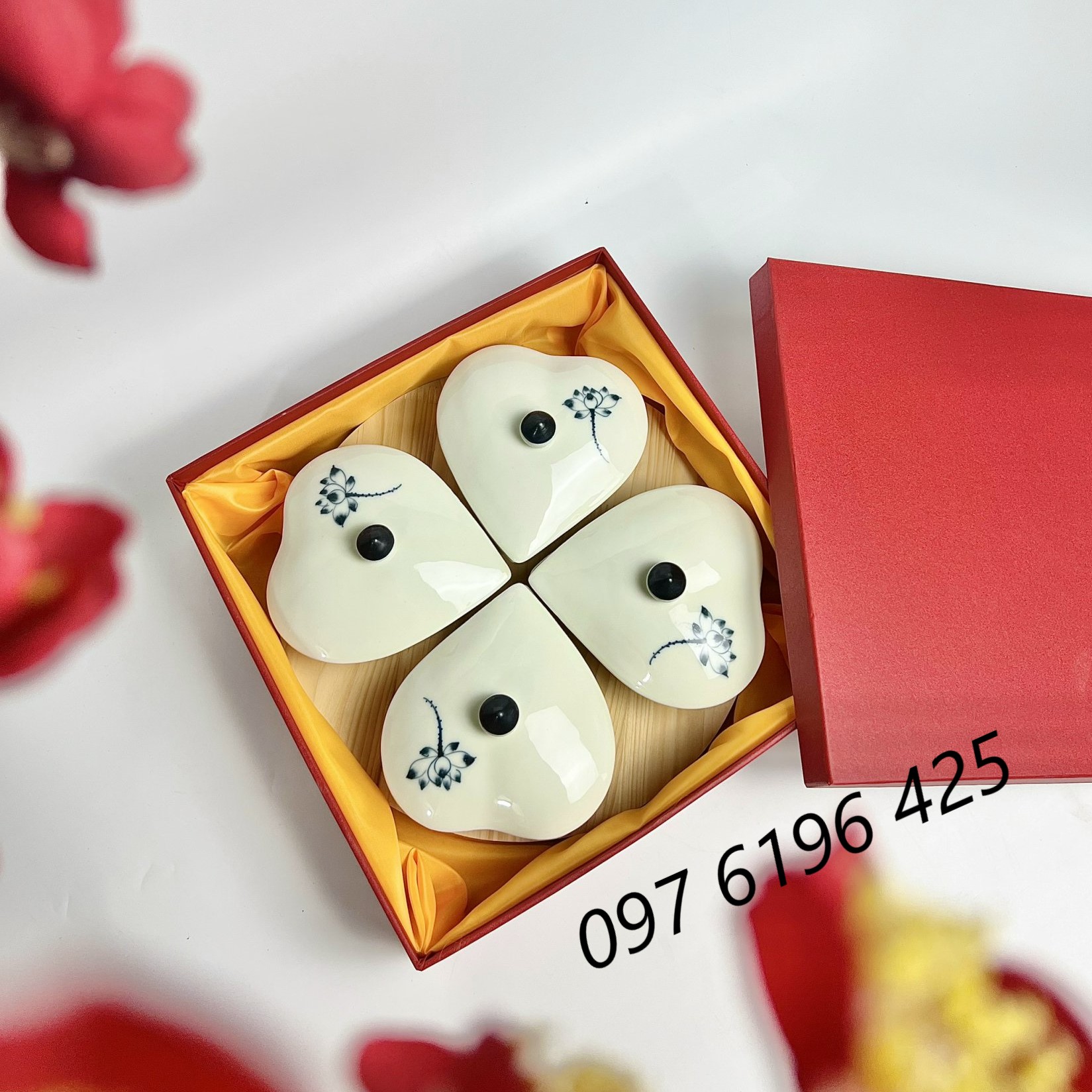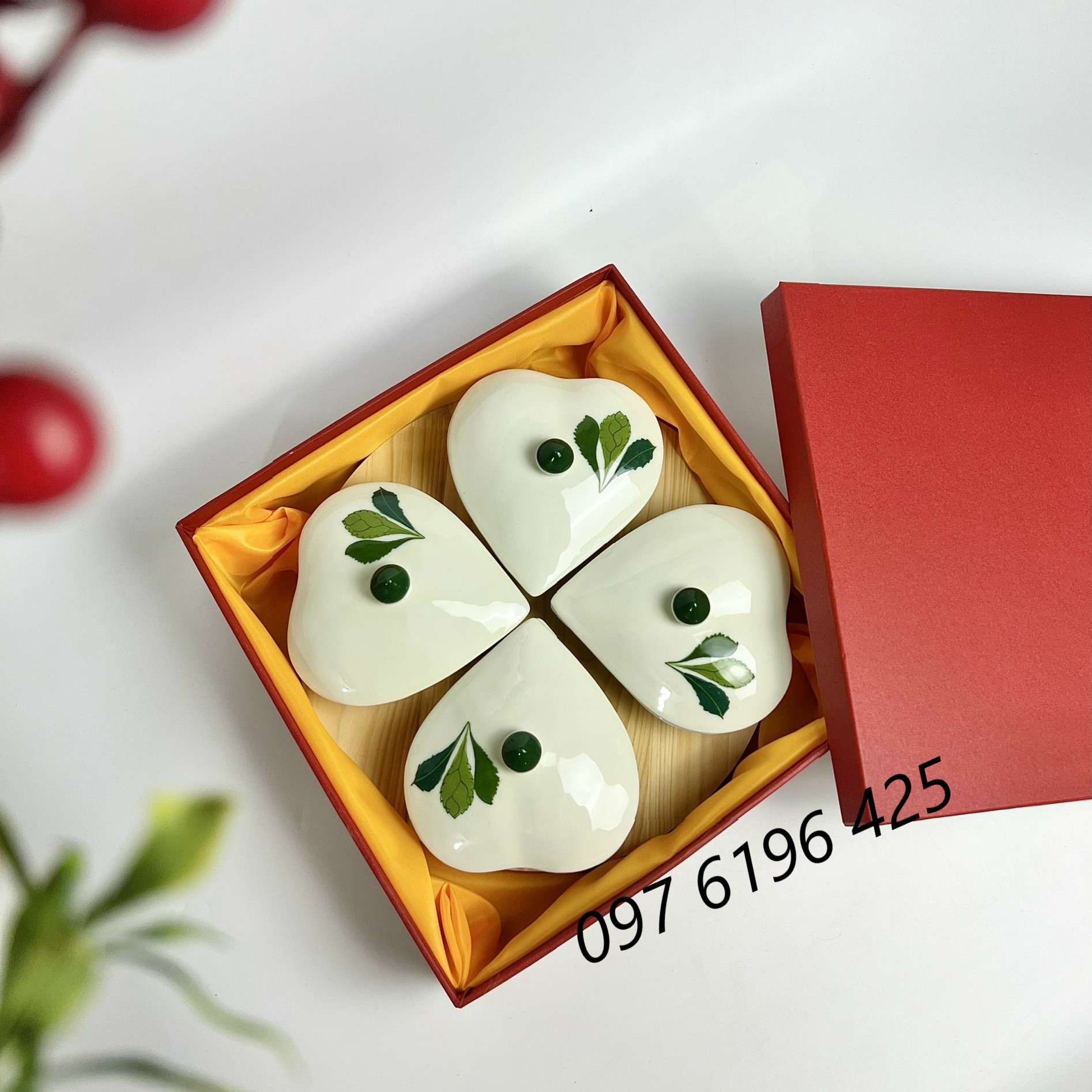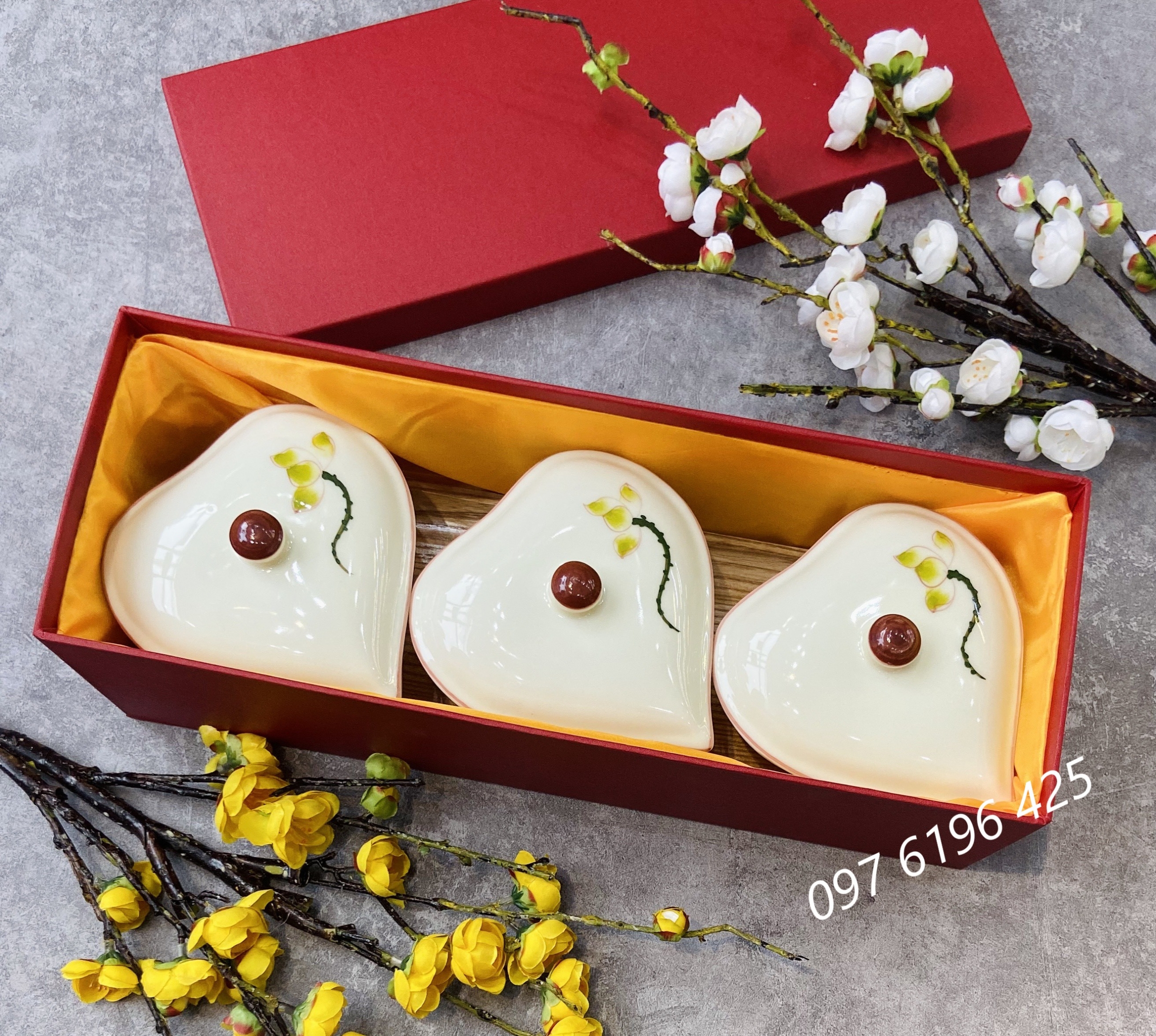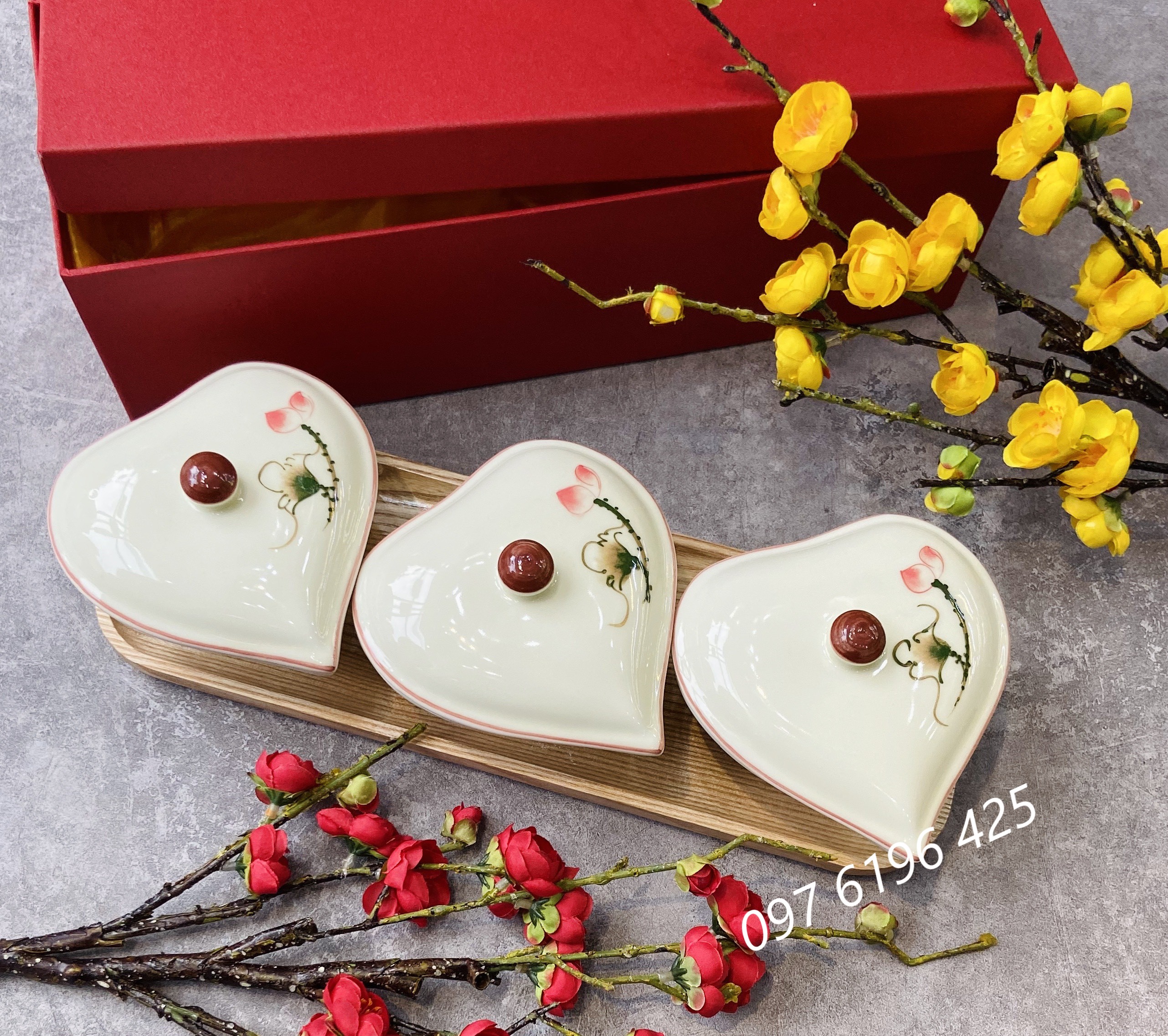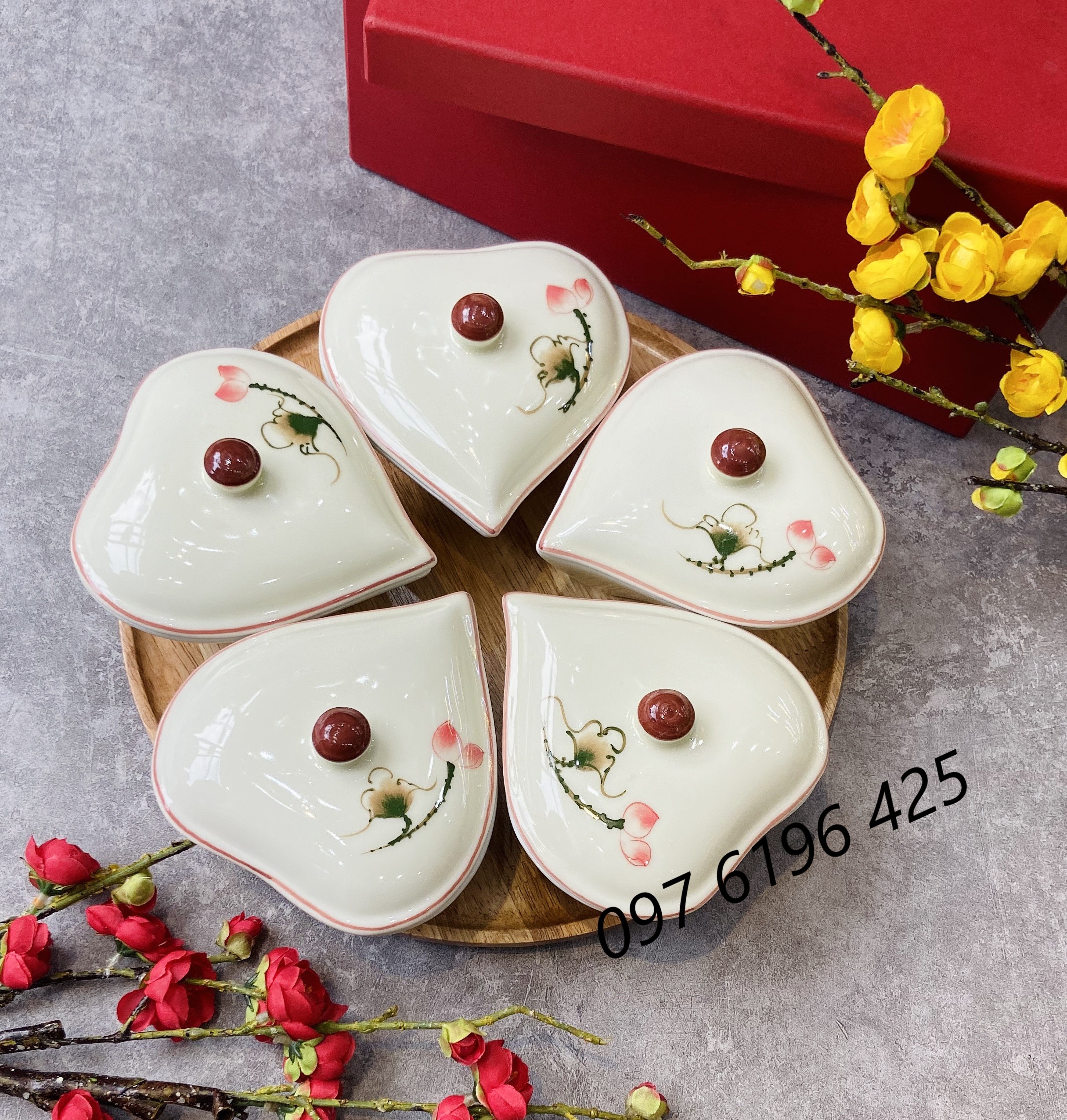 b/ Khay mứt sứ hình tim 4 hũ: