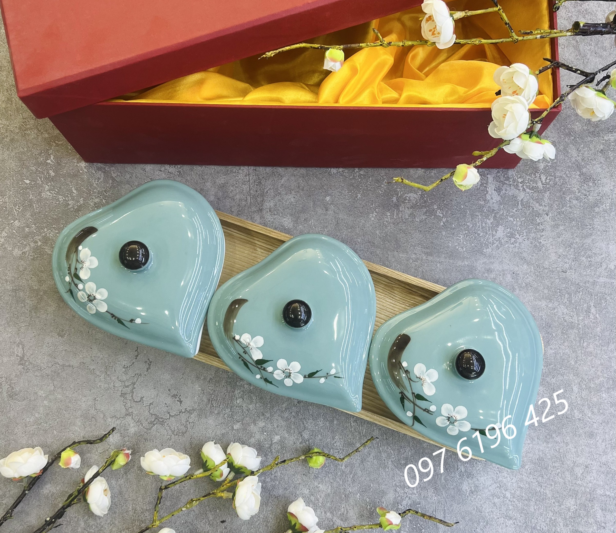 a/ Khay mứt sứ hình tim 3 hũ: