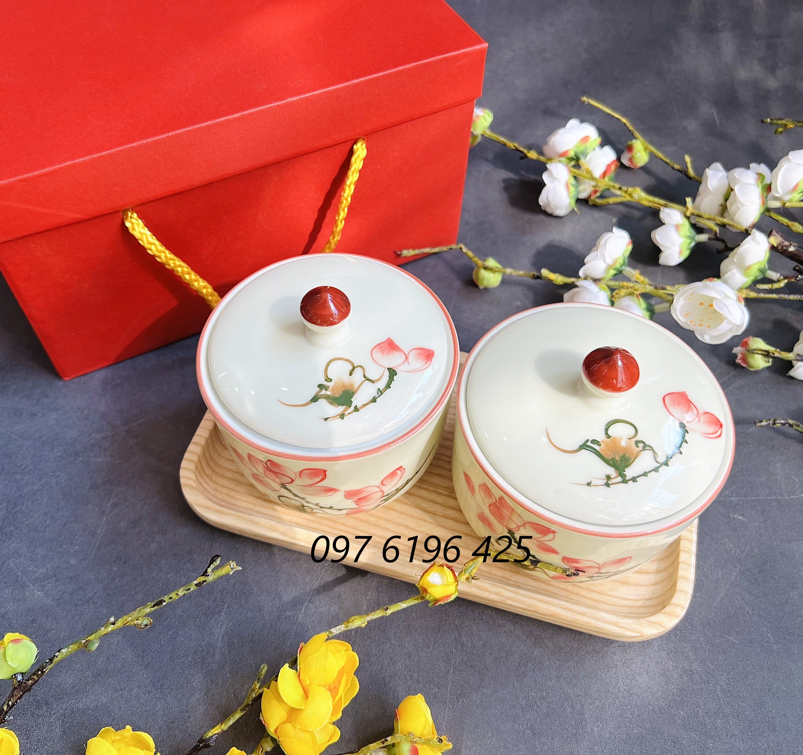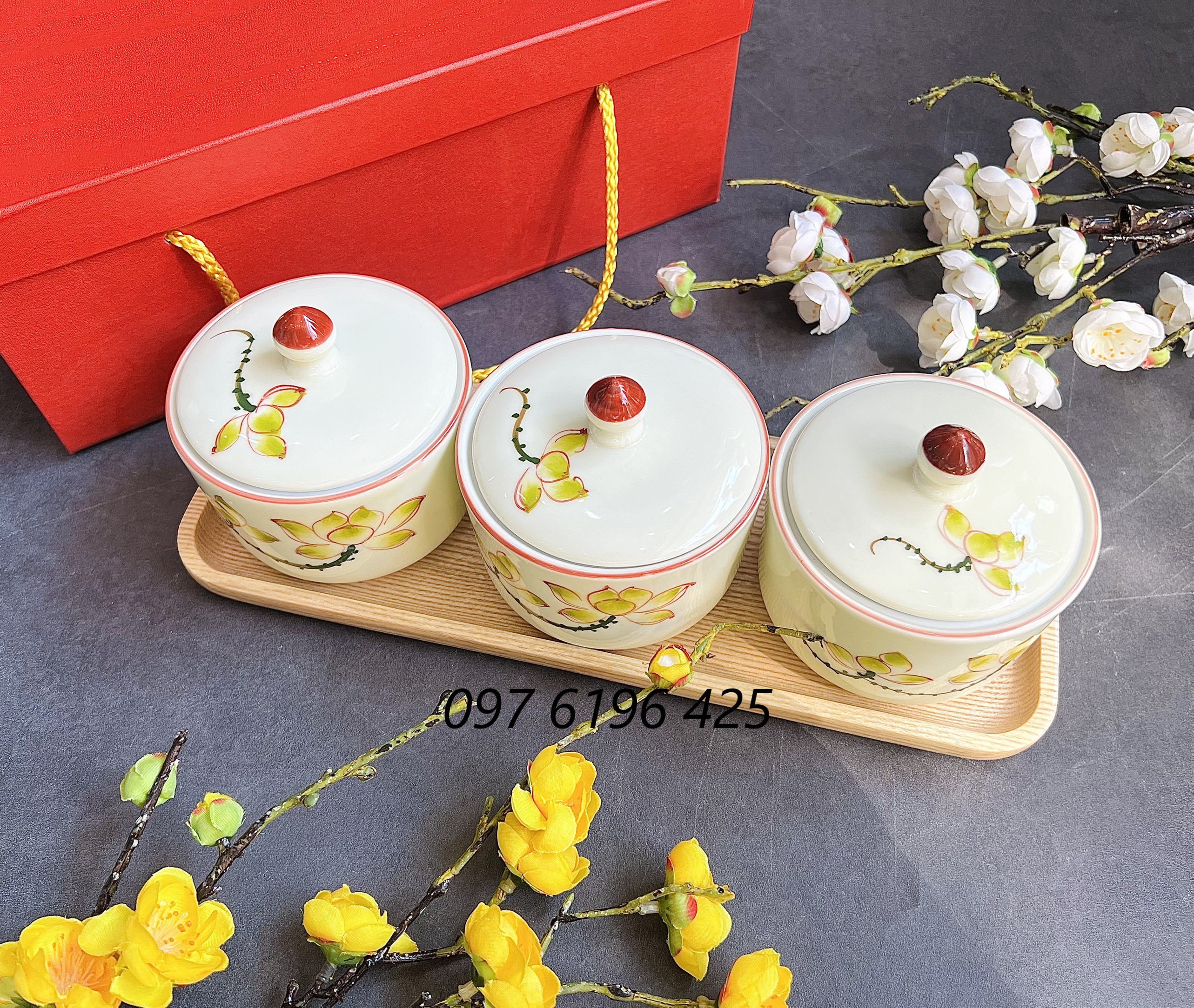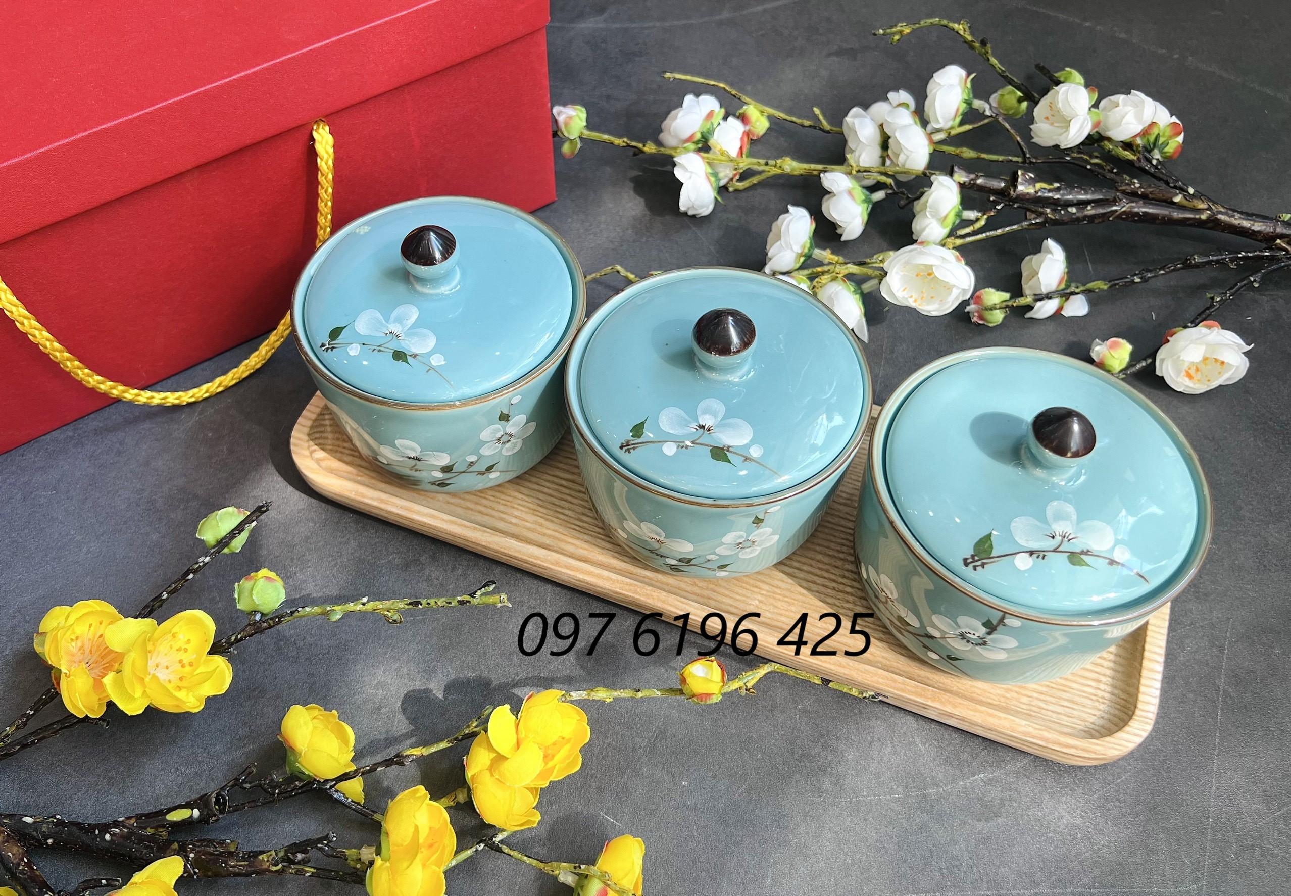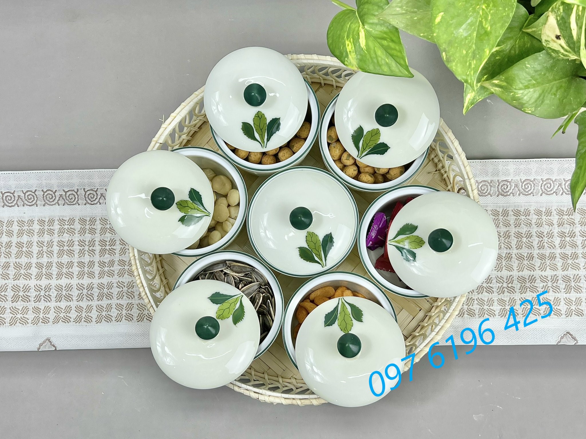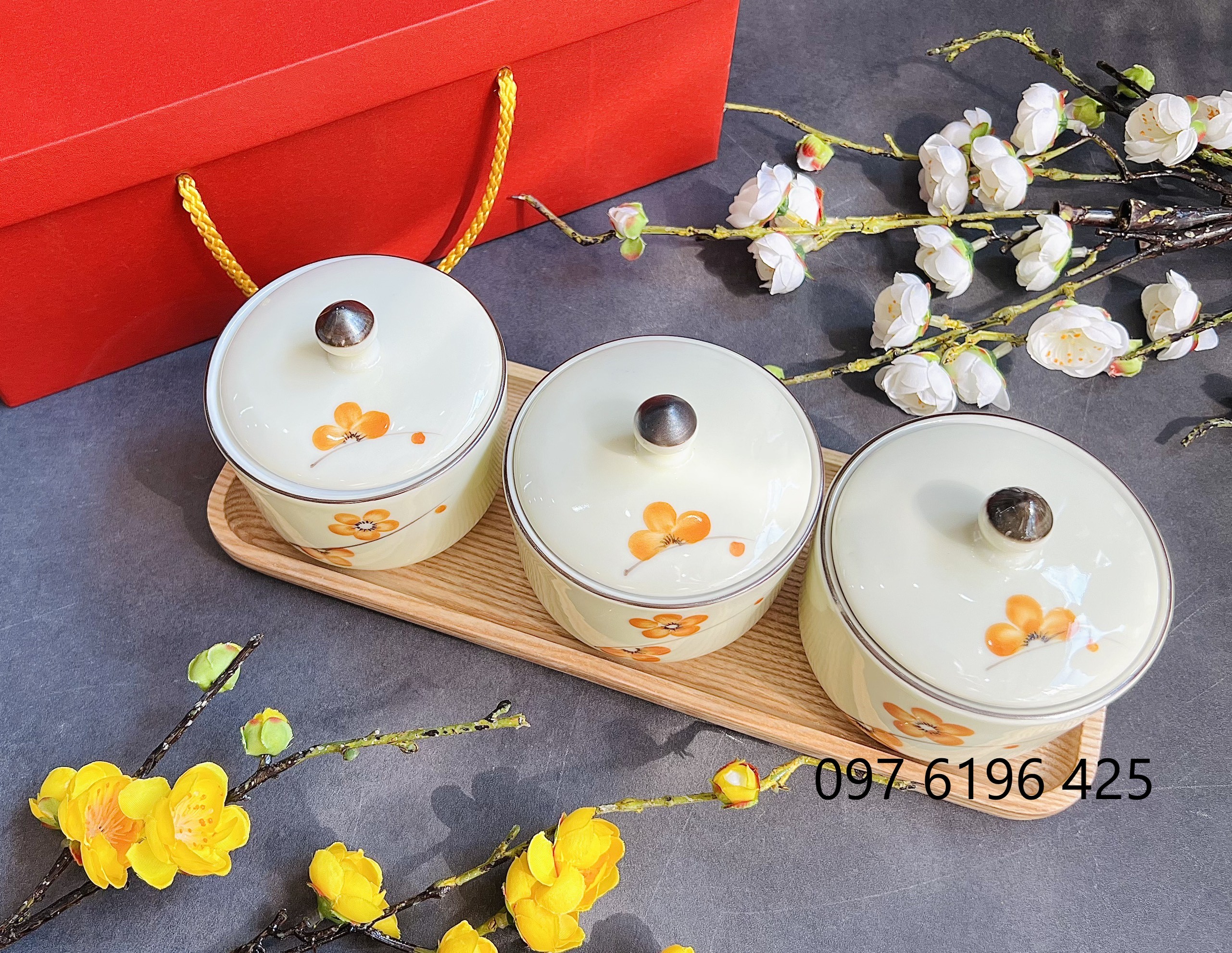 2/ Khay mứt quà tặng gốm sứ Bát Tràng hũ tròn:
