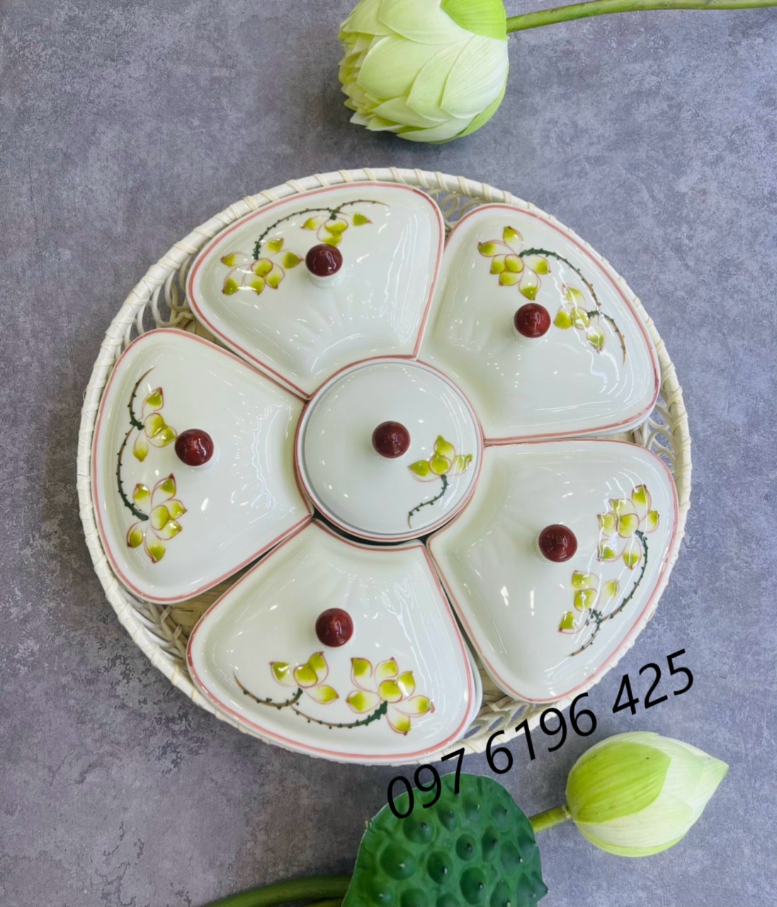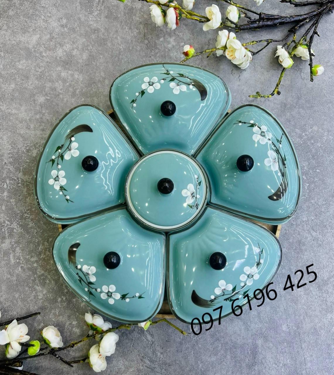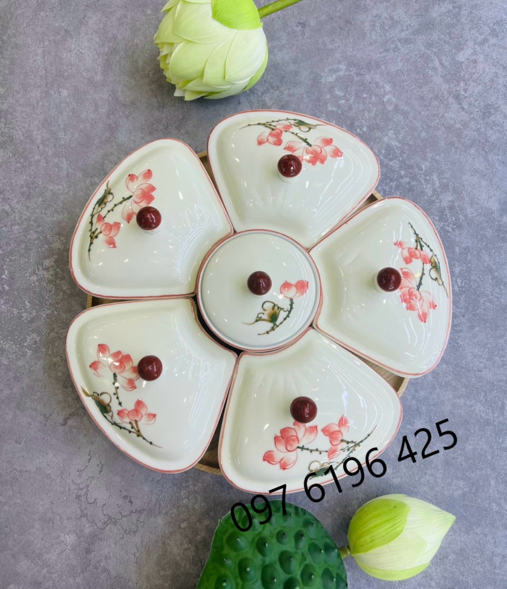 Khay mứt Bát Tràng hoa đào là mẫu khay mứt lớn có đường kính 35cmg gồm có 5 hũ hình cánh hoa và 1 hũ tròn ở giữa. Sản phẩm này đựng trong khay mây hoặc ghép trên đế gỗ.