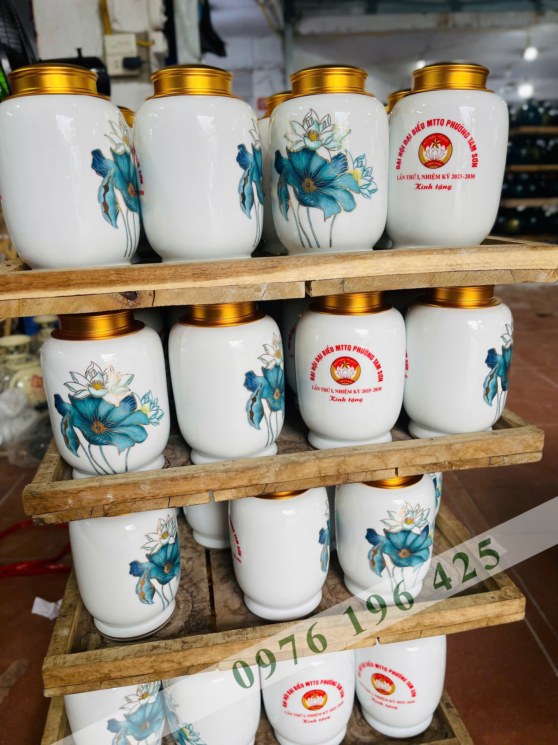 + Chúng tôi nhận sản xuất lọ đựng trà gốm sứ không giới hạn số lượng, giá cả phải chăng và cam kết về chất lượng. Họa tiết logo in trên sứ đảm bảo sắc nét, bền màu vĩnh cửu, không nhòe hay bong tróc.